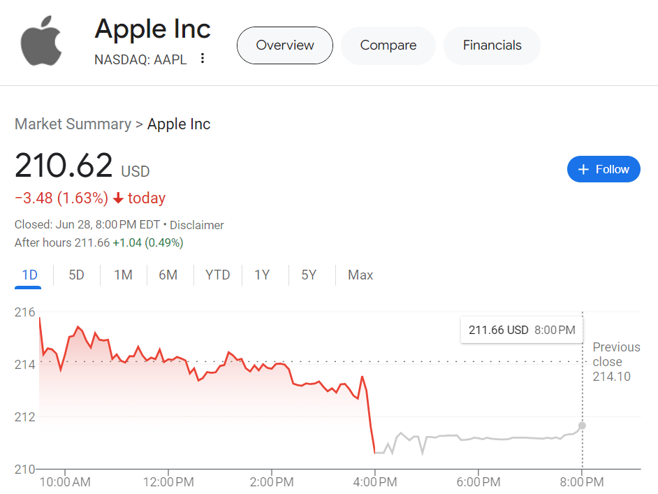 Tomemos el ejemplo de Apple, digamos que queremos saber cual es el valor de la empresa, podemos ver fácilmente el precio de la acción en Google o Yahoo Finance y vemos que el precio es de $210.62 USD: