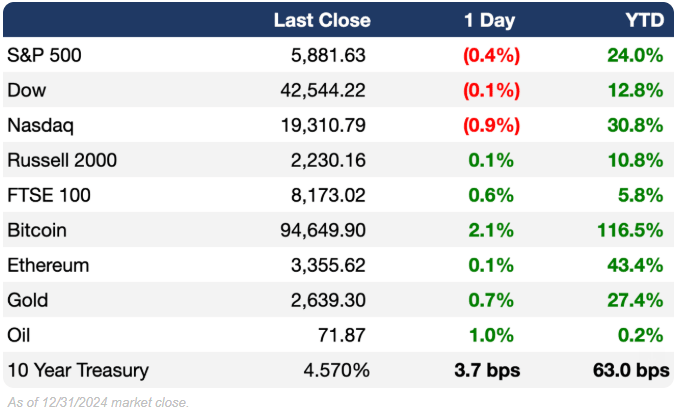 Racha Histórica en EE.UU.: El S&P 500 cierra 2024 con un alza de 24% y logra dos años seguidos con rendimientos superiores al 20%, aunque se ubica 3.5% por debajo de sus máximos históricos.