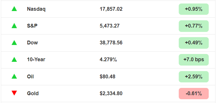 Hoy, los tres principales índices subieron, continuando con el rally del mercado. El S&P 500 alcanzó un nuevo máximo histórico al cierre (again), al igual que el Nasdaq, mientras que el Dow Jones subió 190 puntos.