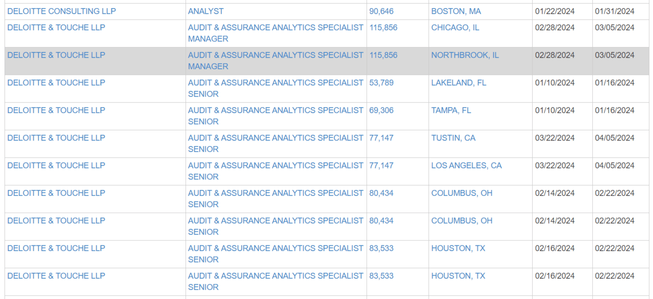 Por ejemplo, al buscar Deloitte en H1BData, podemos ver que los sueldos para el puesto de audit staff oscilan entre $50,000 y $110,000 USD anuales. Esta información es crucial para planificar una posible mudanza y entender las expectativas salariales en el mercado estadounidense.