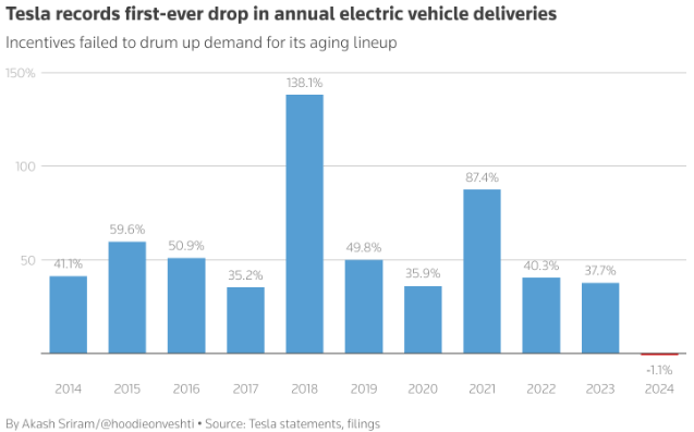 Tesla cae en entregas anuales: Por primera vez en más de una década, las entregas de vehículos Tesla en 2024 disminuyeron, a pesar de las ofertas promocionales de fin de año.